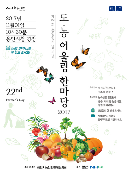 제22회 농업인의 날을 기념해 농업인단체협의회에서 주관하는 이번 행사는 매년 실내에서 기념식 위주로 개최해 왔던 것을 올해는 용인이 도·농복합도시인 점을 감안해 도시민과 함께 하는 어울림 한마당 축제로 변경한 것이다.