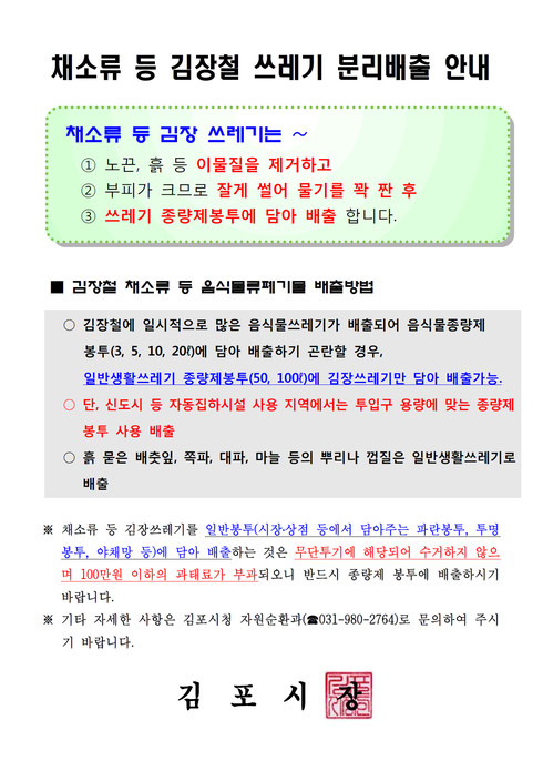 [시사인경제] 김포시는 본격적인 김장철을 맞이해 '김장철 쓰레기 집중처리기간'을 지난 1일부터 오는 12월 15일까지 총 45일간 운영한다고 밝혔다.