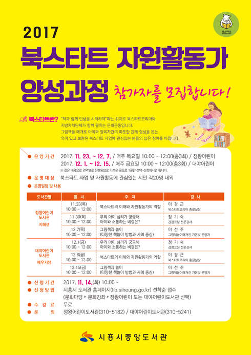 이번 자원활동가 양성과정은 정왕어린이도서관과 대야어린이도서관 2개 도서관에서 진행되며, 기존 자원활동가나 북스타트 자원 활동에 관심 있는 시민 모두 참여 가능하다.