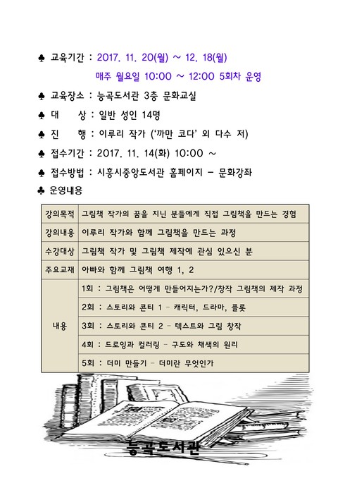 [시사인경제] 시흥시 능곡도서관은 오는 20일부터 <이루리 작가의 그림책 워크숍>을 운영한다.