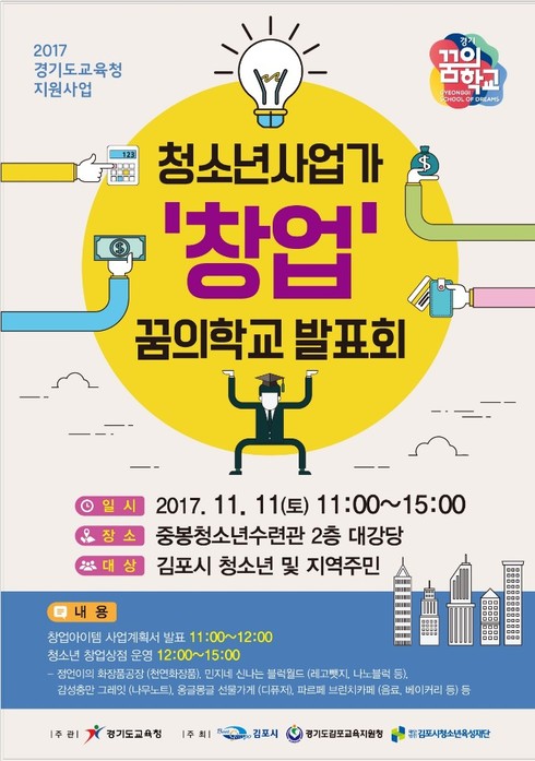 [시사인경제] (재)김포시청소년육성재단 김포중봉청소년수련관에서는 2017년 청소년사업가 ‘창업’ 꿈의학교 발표회를 오는 11일 11시 청소년수련관 2층 대강당에서 개최한다고 밝혔다.