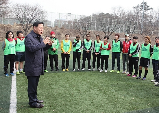 【경기인뉴스】채의선 기자 = 김찬영 팔달구청장은 4일 추운 날씨임에도 불구하고 구슬땀을 흘리며 동계훈련 중인 팔달구 여성축구선수단을 격려하기 위해 수원월드컵경기장 인조축구장을 방문하였다.
