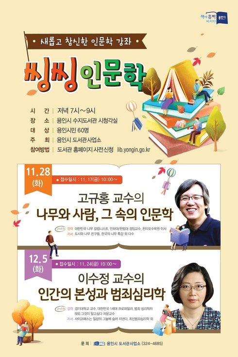 고규홍 교수 강연은 오는 17일부터, 이수정 교수 강연은 오는 24일부터 용인시 도서관사업소 홈페이지에서 매회 선착순 60명씩 신청할 수 있다.