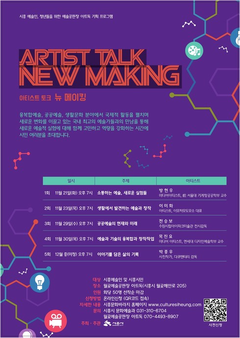 [시사인경제] 시흥시는 월곶 예술공판장_Art Dock에서 융복합예술, 공공예술, 생활문화 분야에서 국제적 활동을 펼치며 새로운 변화를 이끌고 있는 국내 최고의 예술가들과 시흥예술인들의 만남을 통해 새로운 예술적 실험에 대해 함께 고민하는 아티스트 토크 ‘New Making’을 개최할 예정이다.