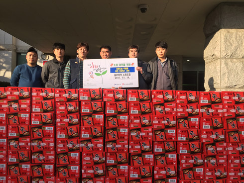 안산 율촌화학(주) 노동조합은 매년 창립기념행사 때 한번 쓰고 버려지는 기념화환 대신 쌀이나 라면을 받아 어려운 이웃들에게 전달하는 나눔활동을 이어오고 있다.