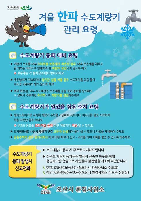 수도계량기 동파 시 주간에는 오산시 환경사업소 수도과(☎031-8036-6389∼6392), 야간에는 오산시청 당직실(☎031-8036-8221∼2) 또는 수도과 상황실(☎031-8036-6135∼6)로 신고하면 된다.