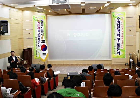 이번 주민설명회는 인권조례제정 추진 경과보고에 이어 이발래 국가인권위원회 법제개선팀장이 『지역사회 인권제도와 지방자치단체의 역할』에 대해 강의했고, 토론회에서는 오동석 수원시 인권조례제정 추진위원회 위원장이 수원시 인권증진 기본 조례안에 대해 발제하고, 강현수 중부대학교 교수, 이발래 국가인권위원회 법제개선팀장의 토론회에 이어 시민들로부터 인권조례제정과 필요성에 대한 질의응답 및 의견을 수렴했다.