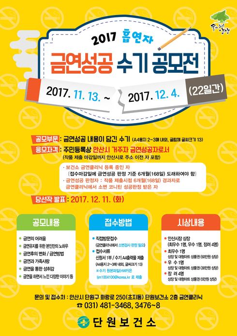 [시사인경제] 안산시 단원보건소는 흡연자의 금연실천 의지를 다지고, 지역사회 금연실천 분위기 확산에 활용코자 지난 13일부터 오는 12월 4일까지 금연성공 수기를 공모한다고 밝혔다.
