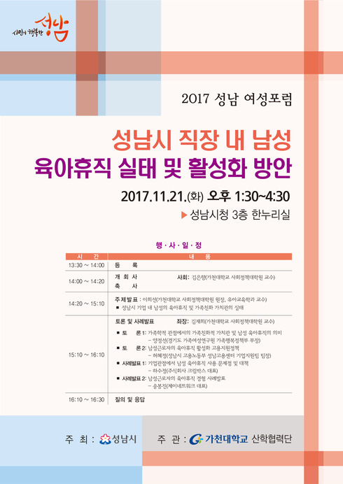 포럼에서 ▲이희선 가천대 유아교육학과 교수는 ‘성남시 기업 내 남성의 육아 휴직과 가족 친화 가치관의 실태’를 주제 발표하고 ▲양정선 경기도 가족여성연구원 가족행복정책부장은 ‘가족 친화적 가치관과 남성 육아휴직의 의미’ ▲허혜정 성남고용센터 기업지원팀장은 ‘남성 근로자의 육아휴직 활성화와 고용지원 정책’ ▲하수정 ㈜크림박스 대표는 ‘기업 관점에서 남성 육아휴직 사용 문제점과 대책’ ▲송봉진 제이네트워크 대표는 ‘남성 근로자의 육아휴직 경험 사례’를 각각 발표했다.