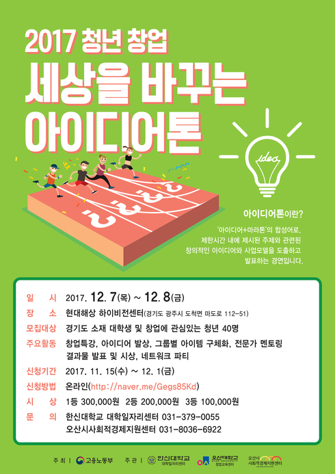 [시사인경제] 오산시는 오는 12월 7일부터 8일까지 2일간 현대해상 하이비전센터에서 한신대 창조일자리센터, 오산대 창업교육센터와 공동주관하는 '2017 오산 청년 세상을 바꾸는 아이디어톤'이 열린다고 밝혔다.