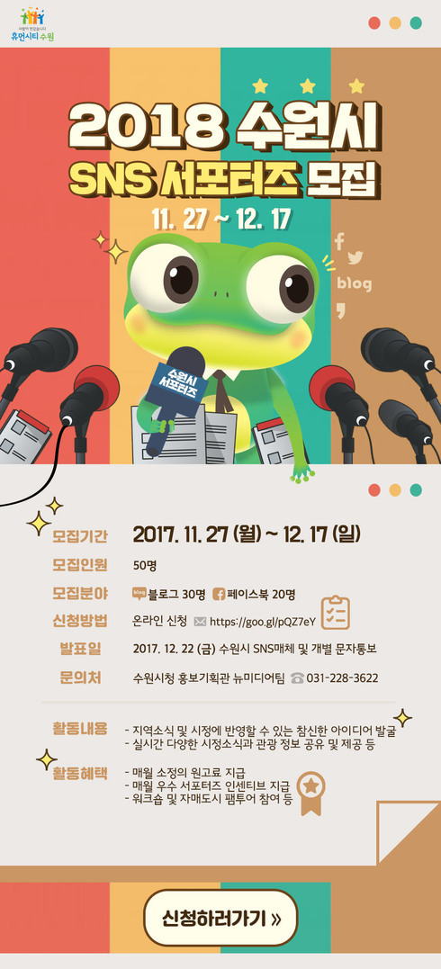 소셜미디어 계정(블로그, 페이스북 등)을 활발히 운영 중인 만18세 이상 수원시민은 누구나 SNS 서포터즈가 될 수 있다. 지원은 온라인 접수 페이지(https://goo.gl/pQZ7eY)에서 할 수 있다. 심사를 거쳐 12월 22일 합격자를 발표할 예정이다.