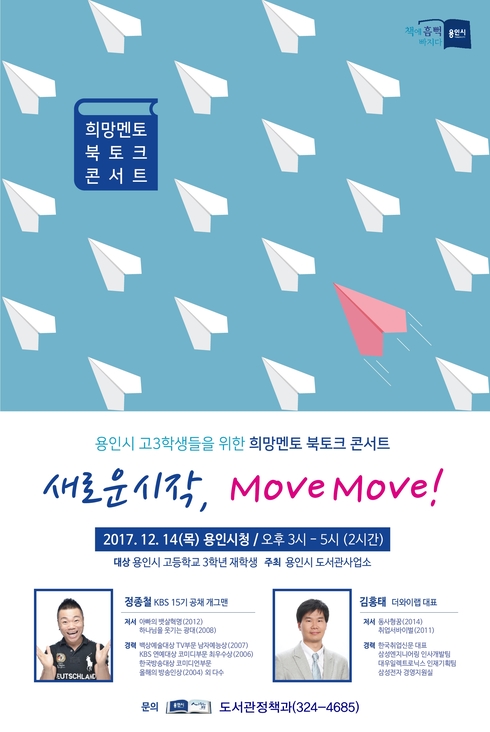 [시사인경제] 용인시는 오는 14일 오후 3시 시청 에이스홀에서 대학수학능력시험을 마친 고3학생들의 진로설계를 돕는 무료 특강 ‘희망멘토 북토크 콘서트’를 개최한다고 밝혔다.