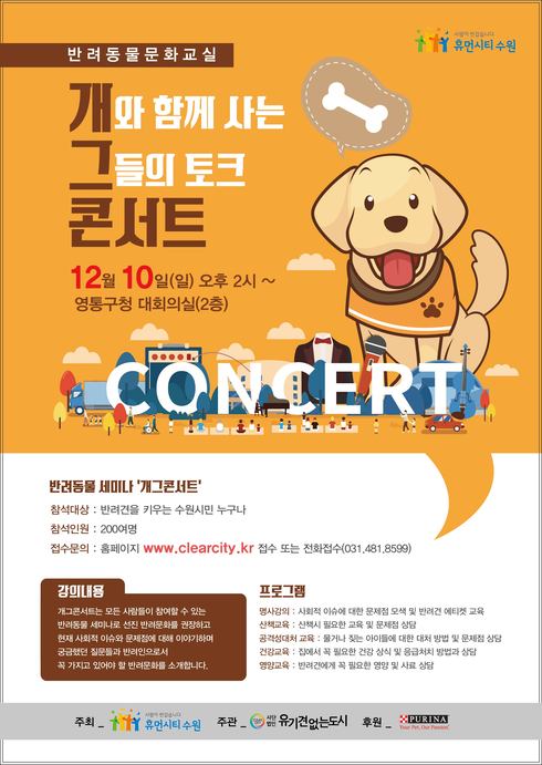[시사인경제] 수원시는 오는 10일 오후 2시 영통구청 대회의실에서 ‘개와 함께 사는 그들의 토크 콘서트’(약칭 개그콘서트)를 주제로 ‘2017 수원 반려동물 문화교실’을 연다.