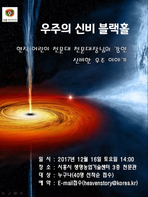 [시사인경제] 시흥시 생명농업기술센터 천문관에서는 오는 16일, 12월 연말 행사로 ‘우주의 신비 블랙홀’을 주제로 시민들의 호기심을 자극할 수 있는 특별한 강의를 준비했다.