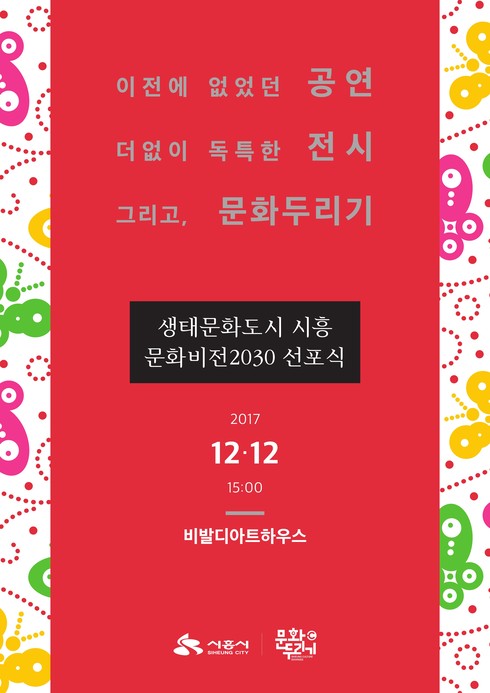 이날 행사에는 김윤식 시흥시장, 김영철 시의회 의장, 국회의원, 시의원, 도의원, 지역 내 문화예술계 인사, 문화두리기 참여자, 시민 등 300여 명이 참석할 예정이다.