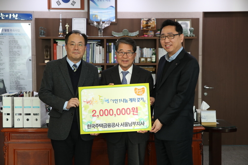 [시사인경제] 한국주택금융공사 서울남부지사는 지난 7일 이천시청을 방문해 복지사각지대에 놓인 어려운 이웃을 위해 써달라며 행복한 동행 사업에 성금 200만 원을 기탁했다.