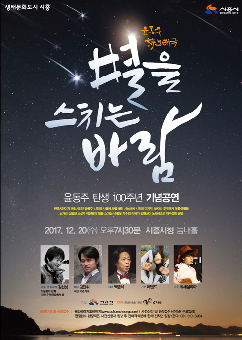 이번 공연은 시흥시가 주최하고 윤동주 시노래극 전문공연기획사인 문화예술기획 ‘시선’이 주관하는 행사로 윤동주 탄생 100주년을 기념해 시인의 시에 곡을 붙인 ‘시노래’와 시인의 마지막 후쿠오카 옥중생활을 소재로 집필된 소설가 이정명의 ‘별을 스치는 바람’을 가수 겸 작곡가 김현성(이등병의 편지 등 작곡)이 노래극으로 재구성해 공연한다.