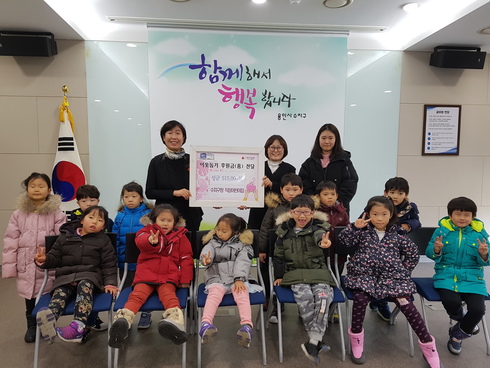 이날 수지구청 직장 어린이집 원아 12명은 교사와 함께 구청을 방문해 나눔장터를 개최해 마련한 수익금 51만5천원을 기탁했으며, ㈜세이프시스템도 100만원을 기부했다.