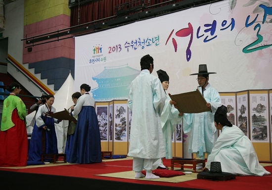 1부 식전 축하공연은 청소년 풍물공연과 성인 부채춤 공연에 이어 2부에서는 성년례로 진행된 행사는 수원청소년문화센터와 수원시예절교육관 공동주관으로 개최되었다.