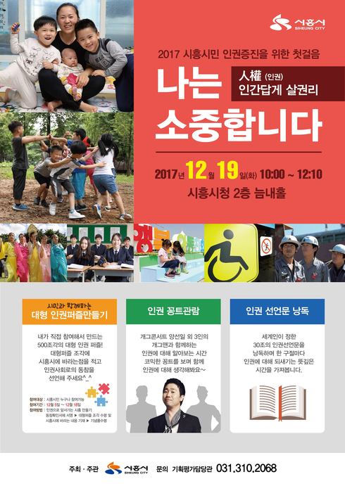 [시사인경제]시흥시는 오는 19일 오전 10시, 시흥시청 늠내홀에서 ‘2017 시흥시민 인권 보호 및 증진을 위한 첫걸음 <나는 소중합니다>’란 주제로 인권문화행사를 개최한다.