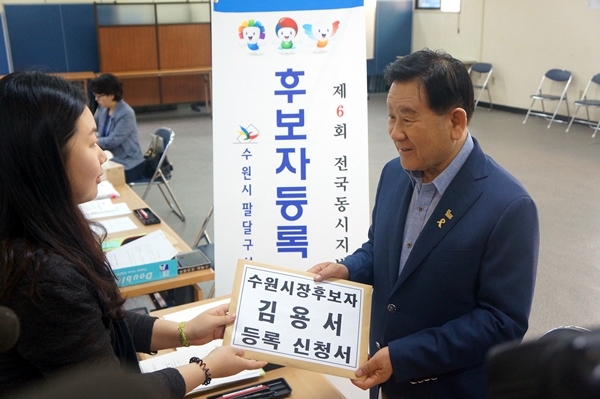 김용서 후보는 이날 오전 9시 30분 수원시팔달구선거관리위원회에서 후보 등록을 마치고 "4년동안 꿈을 잃은 수원에 꿈을 주어 활력이 넘치는 '해피수원'을 만들겠다"고 밝혔다.