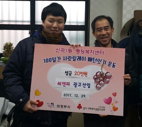 [시사인경제]씨엔피광고산업은 지난해 12월 29일, 100일 사랑릴레이 나눔 행사에 동참하기 위해 어려운 이웃을 위해 성금 20만원을 기탁했다.