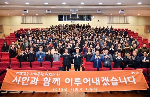 [시사인경제]시흥시가 지난 2일 오전 11시 시흥시청 늠내홀에서 전 직원이 한자리에 모인 가운데 2018년 무술년의 힘찬 발걸음을 함께 내딛는 시무식을 가졌다.