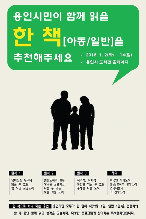 [시사인경제]용인시는 올 한해동안 시민들이 함께 책을 읽는 독서 캠페인 ‘한 책으로 하나 되는 용인’을 펼치기 위해 오는 14일까지 선정 도서 추천을 받는다고 밝혔다.