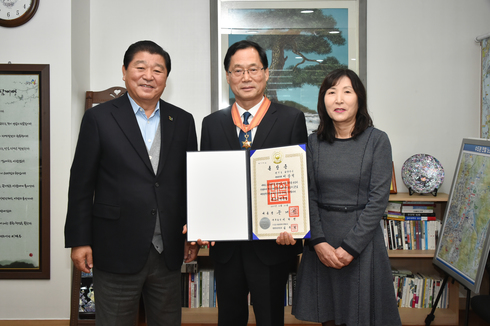 [시사인경제]5일 이석우 남양주시장은 집무실에서 지난해 1월 명예퇴직한 이강석 前 부시장(지방관리관)에 홍조근정훈장을 수여했다.