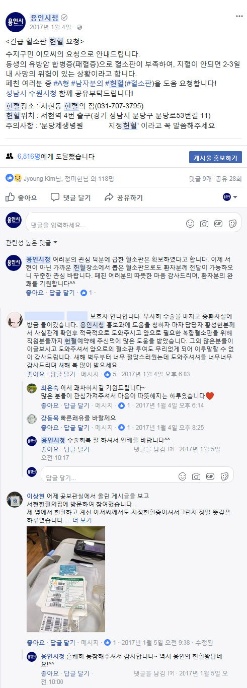 요청을 받은 용인시는 즉시 시 페이스북과 행정정보시스템인 새올게시판에 A씨의 사연을 소개하며 A형 혈액의 긴급 헌혈을 당부했다.