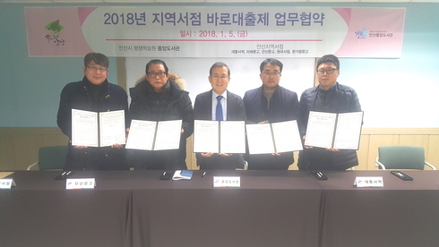 [시사인경제]안산시 평생학습원 중앙도서관은 지난 5일 안산시 지역서점조합 회원 대동서적, 안산문고, 원곡서점, 한가람문고 관내 4개 서점(6개 지점)과 2018년 ‘지역서점 바로대출제’ 사업추진을 위한 업무협약을 체결했다.
