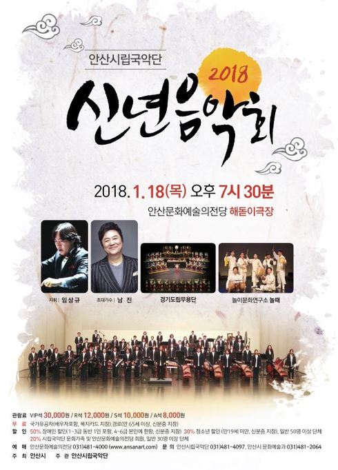안산시립국악단에서 준비한 신년음악회는 오는 18일 저녁 7시 30분 안산문화예술의전당 해돋이극장에서 개최한다.