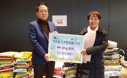 [시사인경제]용인시 수지구는 지난 16일 부동산 개발 시행사인 ㈜스타덤홀딩스에서 연말연시 이웃돕기 ‘사랑의 열차 이어달리기’에 쌀 20kg 짜리 120포를 기탁했다고 밝혔다.