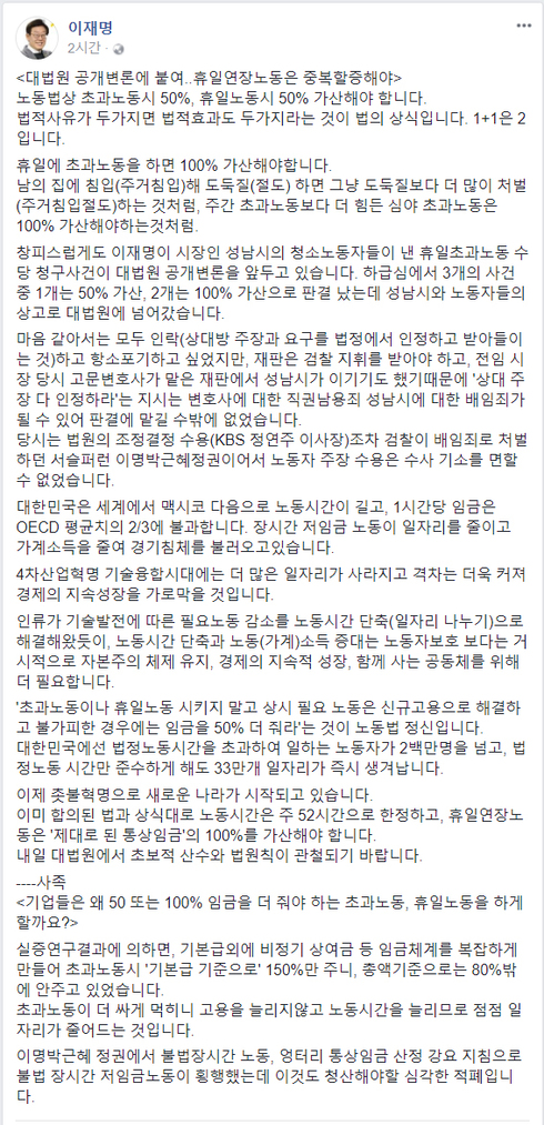 또 “‘초과노동이나 휴일노동 시키지 말고 상시 필요 노동은 신규고용으로 해결하고 불가피한 경우에는 임금을 50% 더 줘라’는 것이 노동법 정신이다”며 “이미 합의된 법과 상식대로 노동시간은 주 52시간으로 한정하고, 휴일연장노동은 ‘제대로된 통상임금’의 100%를 가산해야 한다”고 적었다.