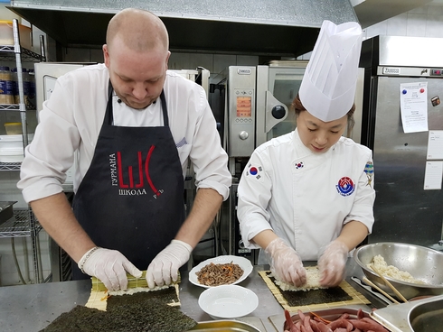 | 한식 조리사(오른쪽)와 니즈니노브로고드 시민이 김밥을 말고 있다 |