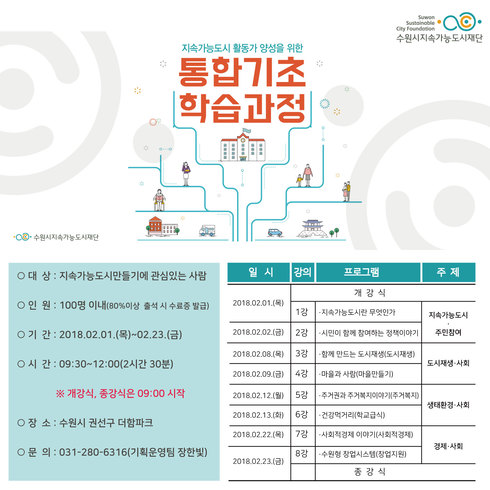 [시사인경제]수원시지속가능도시재단이 오는 29일까지 ‘2018 지속가능도시 통합기초학습과정’ 수강생을 모집한다.