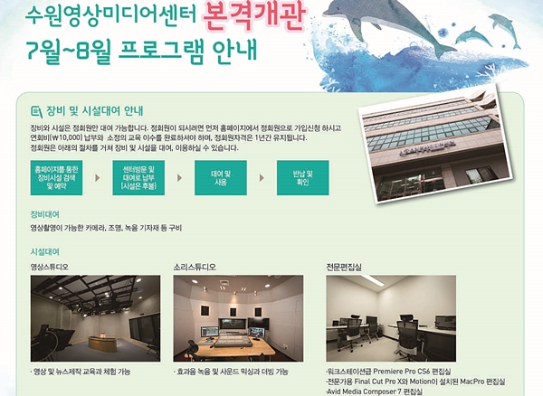 【경기인뉴스】지난 3월 27일에 개관한 수원영상미디어센터가 내달 1일부터 본격 운영을 시작한다. 영상 제작이 가능한 장비대여와 편집실 등의 시설 대관이 가능해지며 정기적인 미디어교육 프로그램과 영화상영 프로그램 및 마을미디어 등 센터의 주요 사업도 정기적으로 운영된다.