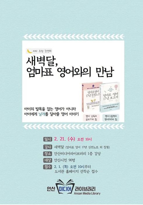 저자는 이날 새벽달의 영어교육 17년 노하우를 통해 아이의 발목을 잡는 영어가 아니라 아이에게 날개를 달아줄 영어이야기를 강연할 예정이다. 강연은 오는 2월 21일 오전 10시 1층 강당에서 진행된다.