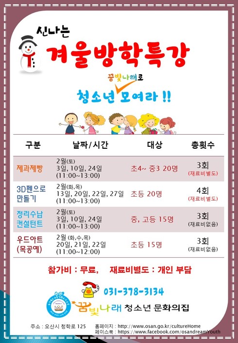 [시사인경제]오산시 꿈빛나래청소년문화의집은 겨울방학을 맞이해 청소년들을 위한 겨울방학 특강 프로그램을 진행한다. 방학특강은 청소년 제과제빵, 3D펜, 정리수납 컨설턴트, 우드아트(목공예) 수업 등으로 2월달 동안 진행되며, 참가비는 무료(재료비 별도)이다.