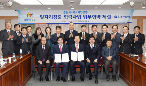 수원시와 IBK기업은행은 29일 수원시청 상황실에서 ‘일자리 창출사업 활성화를 위한 업무협약’을 체결하고 수원시 일자리 창출사업 활성화를 위해 적극적으로 협력하기로 했다.