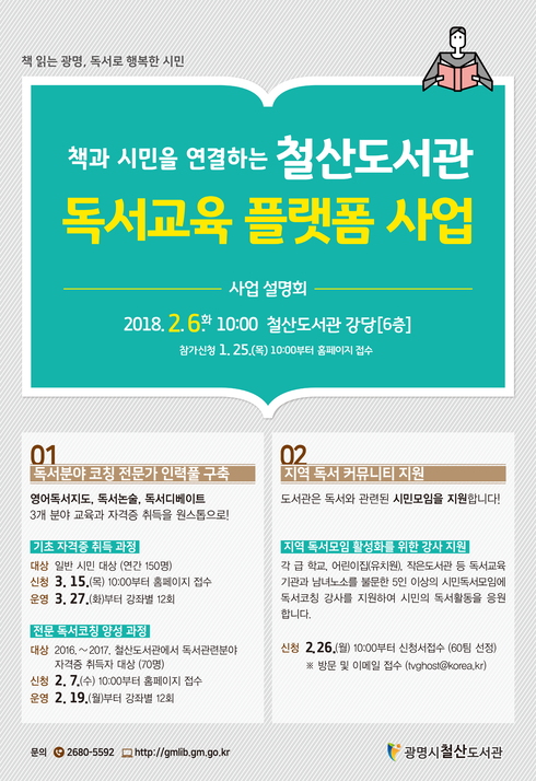 독서교육 플랫폼 사업은 독서교육 전문가 인력풀 구축 사업과, 지역독서모임 활성화를 위한 강사 지원 사업으로 구성된다. 인력풀 구축 사업은 독서관련 분야 자격 취득을 위한 기초 교육과정과, 전문 독서코칭 과정으로 운영된다. 기초교육 과정은 시민을 대상으로 3월 27일부터 6월 20일까지 총 36시간으로 운영하고, 전문 독서코칭 과정은 2016년 ∼2017년 동안 철산도서관에서 독서분야 기초 자격 취득자가 교육 대상이다.