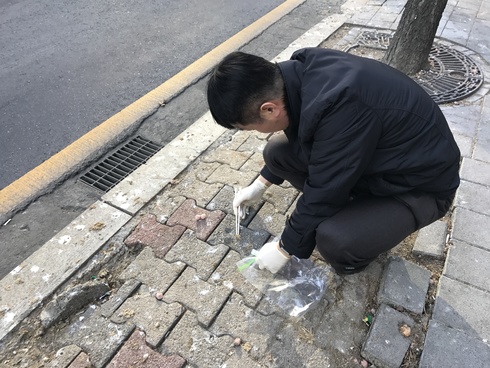 | 수원시 관계자가 떼까마귀 분변을 채취하고 있다 |