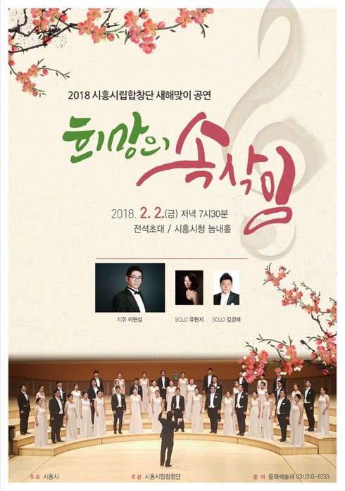 [시사인경제]시흥시가 주최하고 시흥시립합창단이 주관하는 2018 시립합창단 새해맞이 기획공연 <희망의 속삭임>이 오는 2일 저녁 7시 30분 시흥시청 늠내홀에서 개최된다.