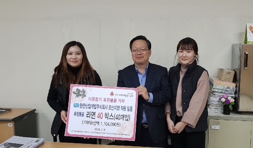 [시사인경제]오산시에 소재한 한전산업개발주식회사 오산지점 직원 일동이 지난 9일 오산시 저소득층을 위한 이웃돕기 후원물품으로 라면 40박스(기부환산액 1,104,000원)를 기탁했다.