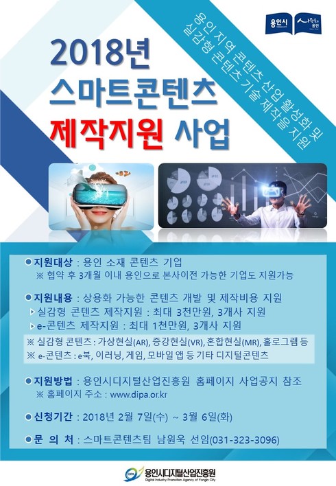 [시사인경제]용인시디지털산업진흥원은 콘텐츠 산업을 활성화 하고 관련 기업의 역량강화를 위해 ‘스마트콘텐츠’ 제작을 지원키로 하고 다음달 6일까지 신청 기업을 모집한다고 밝혔다.