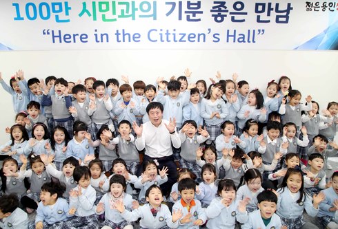 [시사인경제]용인시는 지난 19일 동백동 ‘행복한유치원’ 원생과 원장, 교사 등 80여 명이 정찬민 용인시장을 방문해 바자회 수익금 121만6,230원을 저소득층 어린이를 돕는 ‘디딤씨앗통장’에 기부했다고 밝혔다.