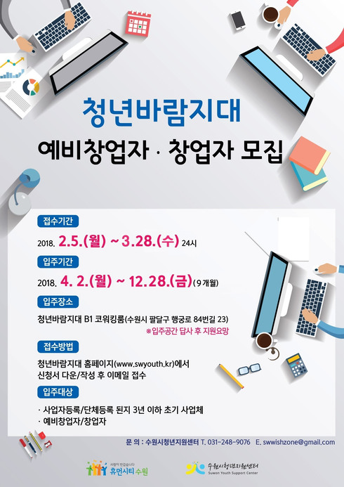 대표자가 수원에 거주하는 창업자·예비창업자(만 19∼39세)이고, 사업자·단체로 등록한 지 3년 이하인 초기 창업체 혹은 예비창업자가 지원할 수 있다. 지원자는 수원 청년바람지대 홈페이지(http://www.swyouth.kr) 회원으로 가입해야 한다.