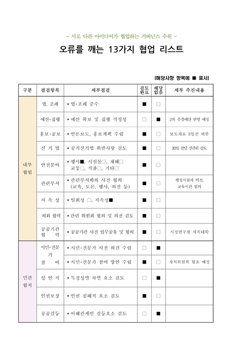 수원시가 만든 ‘오류를 깨는 13가지 협업리스트’는 조직 내부 협업으로 업무능률을 높이기 위해 필요한 ‘내부 협업 항목’ 9개와 시민·전문가 참여를 높이기 위한 ‘민관 협치 항목’ 4개 등 13개 항목으로 이뤄져 있다.