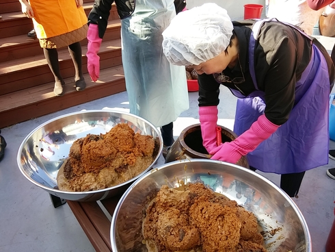 | 지난해 10월 수원시청 본관 옥상 장독대에서 진행된 ‘저염 된장 만들기’ 교육에서 완성된 저염 된장을 장독에서 퍼내는 모습 |