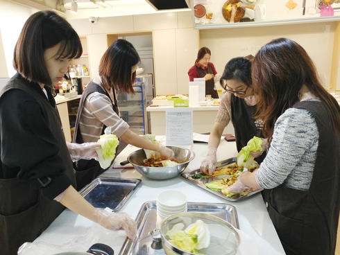 | 지난해 진행된 ‘다어울림 텃밭교실’ 참여자들이 텃밭에서 키운 배추로 김장을 담그고 있다. |
